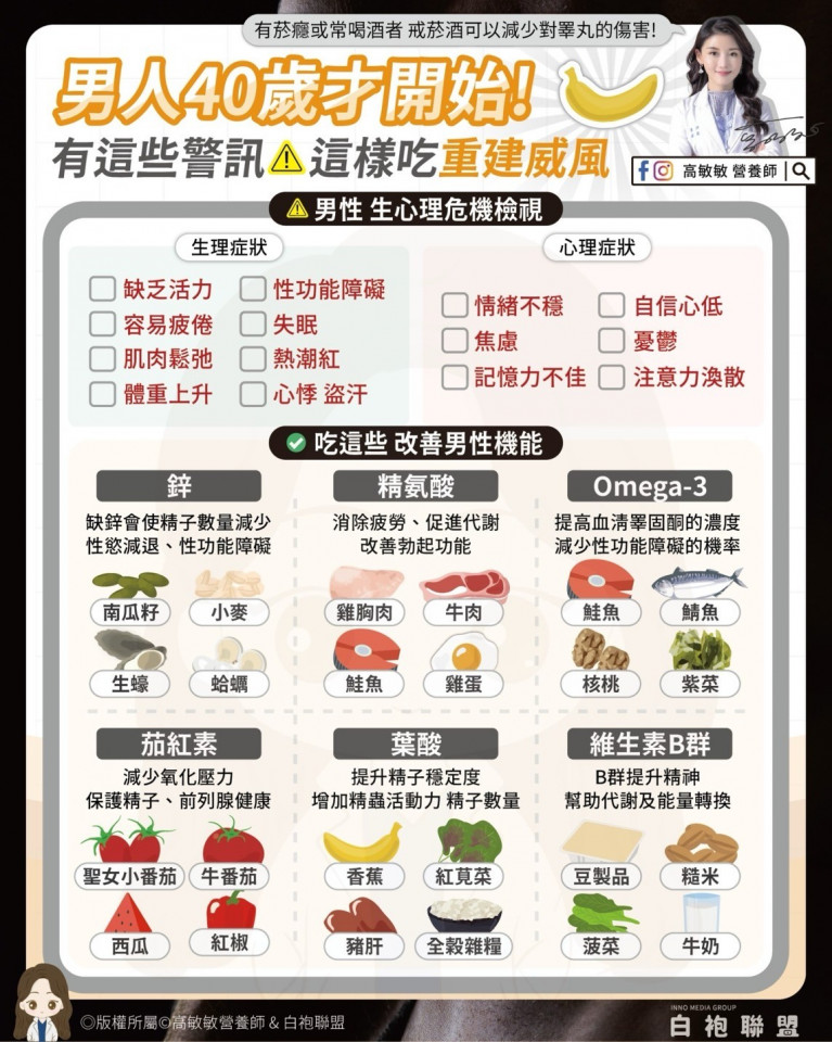 男性機能如何改善?40歲的男性朋友有沒有開始感覺體力不如以往?稍微忙一點就覺得累、肌肉鬆弛無力、肚子也慢慢變大,更糟的是晚上睡不好,偶爾還會心悸或突然冒汗。當你出現這些症狀時一定要提高警覺,因為這是身體在對你發出的警訊。不只是身體的變化,心理狀態也可能跟著受影響!如果忽視不僅影響男性功能,還可能加速中年危機的來臨!療日子邀請高敏敏營養師來分享男性如何吃可以重建威風!