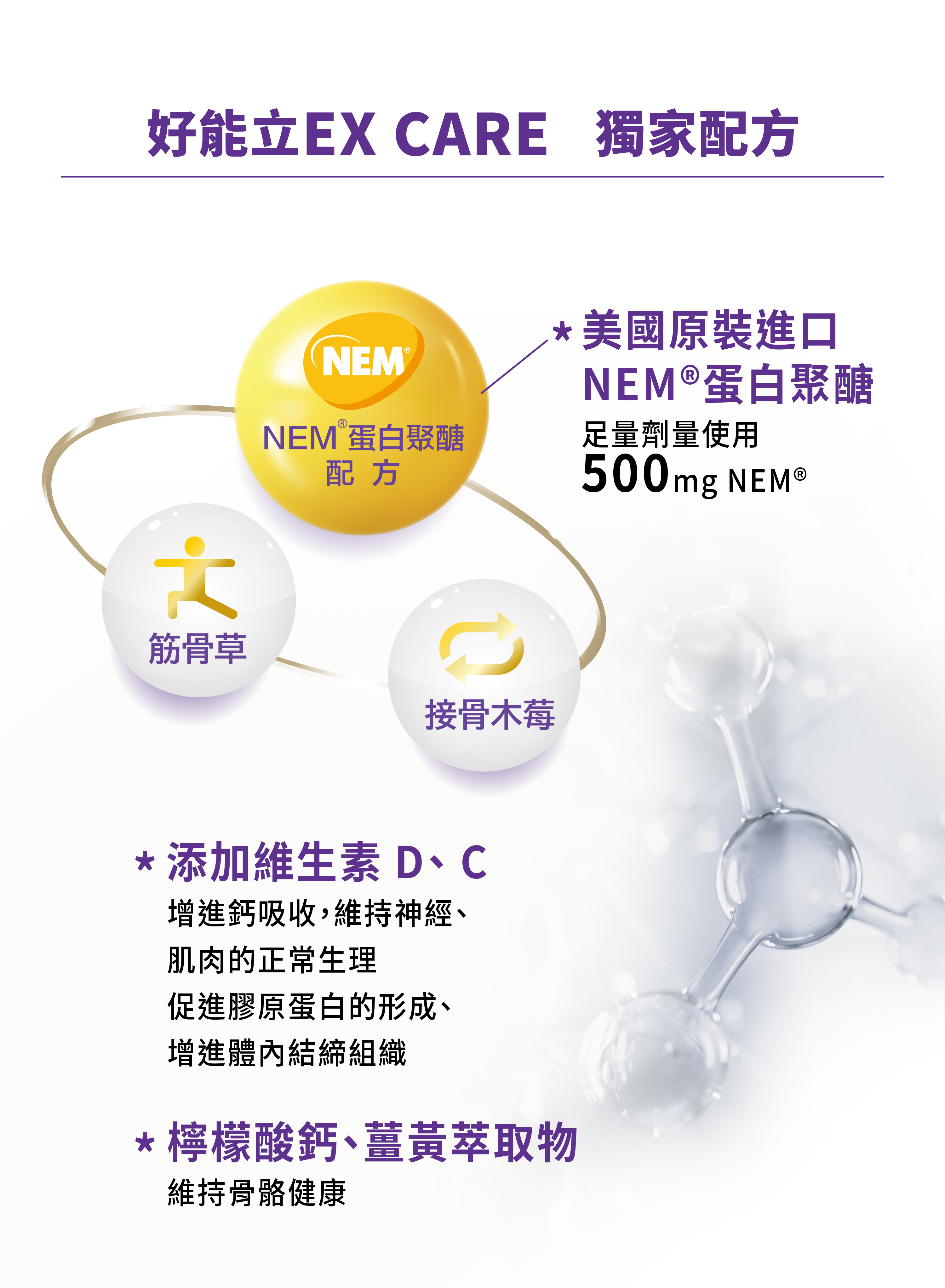不少品牌儘管價格低廉,但卻添加了少量的主成分。在考慮價格的同時,我們更應該注重產品中主要成分的含量。好能立EX CARE以足量添加美國專利NEM為保證,確保您獲得更優質的保養品質。