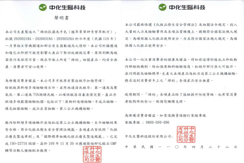 ▲中化生醫科技聲明書。(圖/翻攝自綠的Green-NO.1抗菌專家臉書)