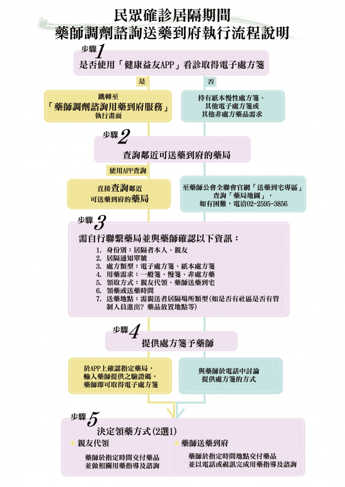 步驟5、2選1決定領藥方式:(1)可選擇親友代領。藥師於指定時間交付藥品,並做相關用藥指導與諮詢。(2)亦可選擇藥師送藥到府。藥師於指定時間地點交付藥品,並以電話或視訊完成用藥指導與諮詢。