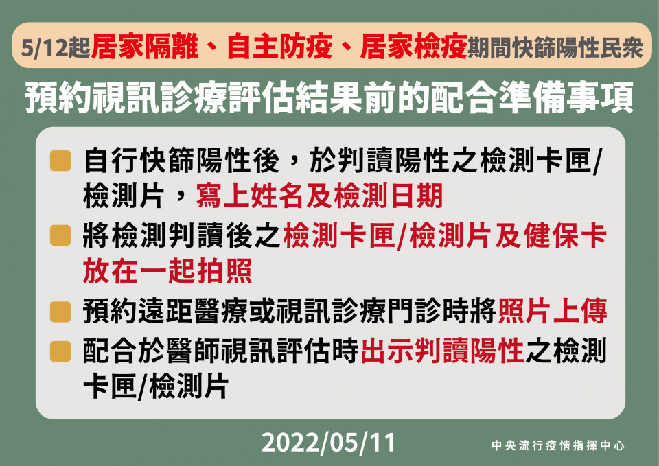指揮中心今(11)日公布,明(12)日起居家隔離、自主防疫及居家檢疫期間快篩陽性預約視訊診療評估前的準備事項: