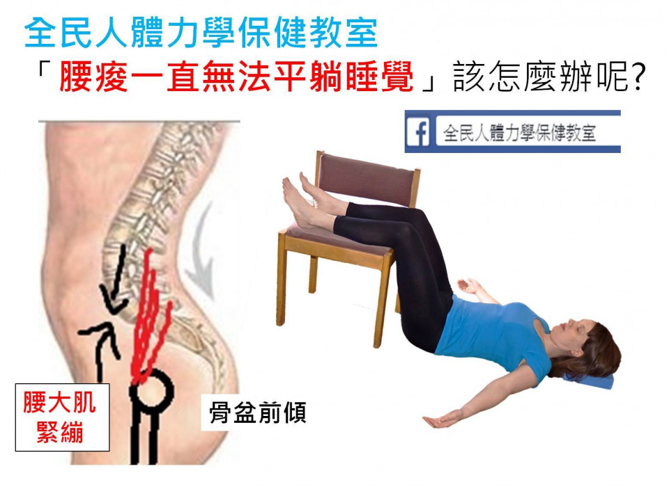 根據「全民人體力學保健教室」,若有嚴重的骨盆前傾睡覺時常會「腰大肌緊繃」,甚至在平躺且雙腳伸直的時候感到腰部下面空空的、「腰椎擠擠的」、「腰部痠痠的」等不適。建議可在睡前將雙腳擺放在椅子上,維持下圖的姿勢20~30分鐘,可暫時緩解不適,有益睡眠品質。