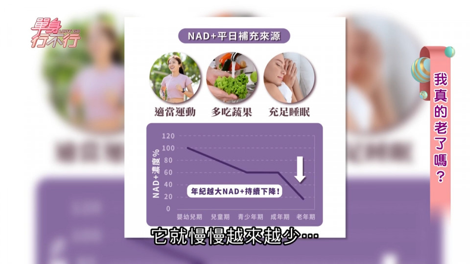 張益堯營養師說明,身體有一個很重要的細胞成分「NAD+」(諾加因子),它是人體代謝的一個指標,通常隨著年紀越大,NAD+就會持續下降,所以平常會建議大家透過運動、攝取蔬果、充足睡眠來補充,但是近年來,有一個叫NMN(β-煙醯胺單核苷酸)的元素,會提高諾加因子,來幫助我們延緩老化的狀況,這個新穎的青春保健元素在日本掀起風潮。